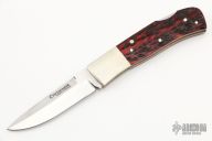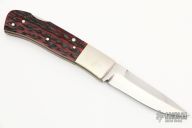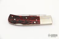 This lockback by Centofante features a hand rub satin finished blade with nail nick and false top edge. The handle has nickel silver bolsters, red jigged bone scales, nickel silver pins and liners and a stainless steel spring. Nice lockup and blade seating. #007 inside the spring. Comes with a zippered case. Excellent condition.