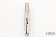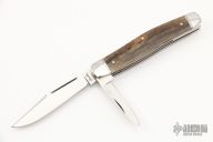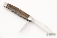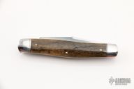 This Serpentine Jack by Joel Chamblin features a hand rub satin finished blade with nail nick and a pen blade with nail nick. The handle has stainless steel bolsters and liners, mammoth ivory covers with gold pins, stainless steel springs. Has some light scratches, otherwise excellent condition.