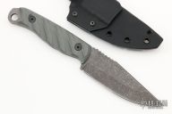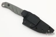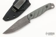 This Crow Jr by Half Face Blades features a tumbled blade with a notched thumbrest, .138" blade stock, 1.312" blade depth, full tang construction. The handle has gray G-10 scales. Comes with a kydex sheath with clip. Excellent Condition.
