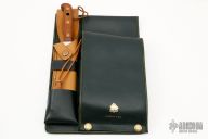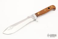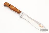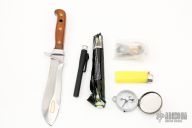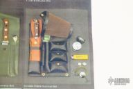 This Survival Kit by Puma features a curved blade for cutting, slicing and skinning and a strong back edge for hacking, partially serrated edge and notched thumbrest, .230" blade stock and 1.406" blade depth, full tang construction. The handle has an aluminum guard with wood scales. Comes with original brown leather sheath, box, survival kit with original items and papers. Has a couple light scratches, otherwise excellent condition. #41582 on guard.