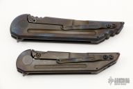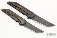 Custom Kwaiback & Radford Set.  Both knives feature a fallout blade.  The handles have a bead blasted zirconium "A" side and backspacer with an anodized titanium lockside.  Tip up anodized titanium pocket clip.  Both include the Hockback leather cases and a COA.