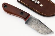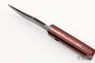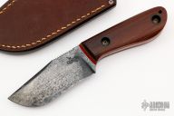 This MoonCusser by Patrick Doyle has a custom patina finished blade with false top edge and a notched thumbrest, thickness of .149" and a depth of 1.22". Full tang construction with vintage cross-cut natural canvas micarta scales, green and red G-10 liners with lanyard hole, the tang and blade spine have an eggshell texture and the screws are stipple textured and bronzed. Knife comes with a brown leather sheath with pocket clip made by Treeman Leather Shop. Comes with original box. New from maker!