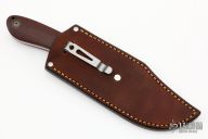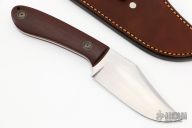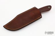 This Buccaneer by Patrick Doyle has a hand rub satin finished blade with false top edge and a notched thumbrest, thickness of .153" and a depth of 1.42". Full tang construction with vintage linen scales, red and green G-10 liners with lanyard hole, the tang and blade spine have an eggshell texture and the screws are stipple textured and bronzed. Micarta collars. Knife comes with a brown leather sheath with pocket clip made by Treeman Leather Shop. Comes with original box. New from maker!