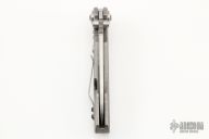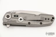 This Frame lock Flipper has a stonewashed S35VN tanto blade with dual thumb studs, flipper, and filed thumb rest. Handle is stonewashed and anodized titanium with stainless steel lock bar insert, manual lock safe system (preventing the lock bar from sliding to the open position, making this knife a virtual fixed blade), stonewashed titanium backspacer and tip up clip, and lanyard hole. This is an impressive piece with superb ergonomics and mechanics. Flips like a champ on caged bearings, dead center blade seating and rock solid lockup. Very nice work. Excellent condition. Comes with zippered case. #045