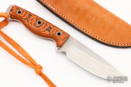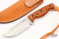 This knife features a flat saber ground drop point blade, .188" blade stock and 1.426" blade depth, full tang construction. The handle has orange/black G-10 scales with hollow tube pins, and an extended tang with lanyard hole. Comes with a brown leather sheath. Has been resharpened, very sharp, excellent condition.