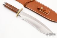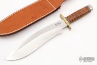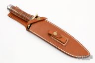 This Randall Style Sasquatch by RBH Custom Knives features a satin finished blade with a false top edge, .175" blade stock and 2.320" blade depth, hidden tang construction. The handle has a brass guard, stacked leather grip with black/white spacers and a stainless steel butt. Comes with a brown leather sheath. Has a few scratches, otherwise excellent condition.