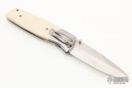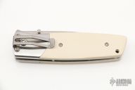 This PXL by Fallkniven features a satin finished drop point 3G laminated steel blade with swedge and dual thumb studs. The handle is comprised steel bolsters and ivory paper micarta scales over steel liners and stand offs. Lanyard hole in pommel. Excellent condition. Comes with original box.