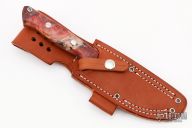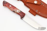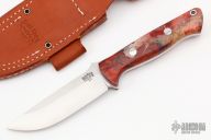 This Bravo-1 by Bark River Knives features a satin finished blade with notched thumbrest, .217" blade stock and 1.155" blade depth, full tang construction. The handle has red/black maple burl scales with lanyard hole. Comes with a brown leather sheath and original box. Excellent condition.