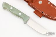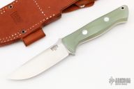 This Bravo-1 by Bark River Knives features a satin finished blade with notched thumbrest, .217" blade stock and 1.151" blade depth, full tang construction. The handle has Ghost Green Jade G-10 scales with lanyard hole. Comes with a brown leather sheath and original box. Excellent condition.