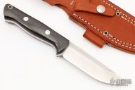 This Bravo-1 by Bark River Knives features a satin finished blade with .217" blade stock and 1.141" blade depth, full tang construction. The handle has carbon fiber scales with red liners and a lanyard hole. Comes with a brown leather sheath and original box. Excellent condition.