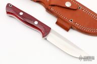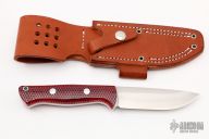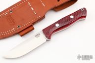 This Bravo-1 by Bark River Knives features a satin finished blade with .217" blade stock and 1.141" blade depth, full tang construction. The handle has red C-Tek scales with red liners and a lanyard hole. Comes with a brown leather sheath and original box. Excellent condition.