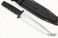 This Tigershark from SOG Knives features a satin finished clip point blade with swedge. The handle is comprised of a rubberized grip over hidden tang construction. Lanyard hole in pommel. Includes black kydex sheath with belt loop. Has some scratches, otherwise excellent condition.