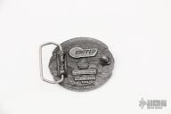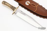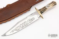 This bowie from Colt features clip point bowie style blade with file worked spine and false top edge, .310" blade stock and 1.872" blade depth, full tang construction. The handle is comprised brass guard and stag scales over brass liners. Excellent condition. Includes leather sheath with concho, belt buckle, original box and COA.