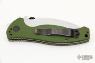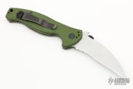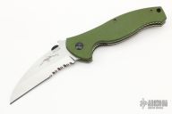 "When the U.S. Navy needed a rescue knife they came directly to Emerson Knives. The SARK knife was designed specifically for emergency use situations where safety and effectiveness are equally important. This is an official issue rescue knife to the elite U.S. Navy Rescue Teams." Bead blasted partially serrated blade with sharp tip, wave feature, and thumb disk. Textured green G10 scales. Notching in thumb rest and finger hold area. Excellent condition. Comes with a zippered case.