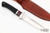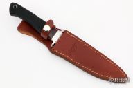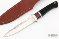 This Baby Hattori Fighter by Junglee Knives features a satin finished recurve MVS-8 Stainless Steel blade with false top edge and partial serrations, .198" blade stock and 1.353" blade depth, hidden tang construction. The handle has a nickel silver guard with checkered rubber grip, nickel silver and wood spacers. Comes with a brown leather sheath, original box and papers. Excellent condition.