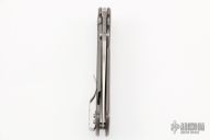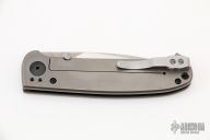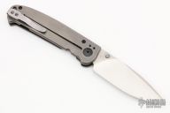 This Acies by AG Russell features a satin finished drop point blade with notched thumbrest and dual thumbstuds. The handle has a bead blasted titanium frame, lockbar stabilizer, tip up or down reversible stainless steel clip. Nice detent, lockup and blade seating. Excellent condition. Comes with a zippered case.
