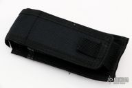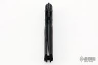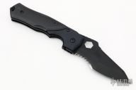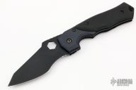A tactical folder designed by Steve Ryan. Partially serrated edge. Top edge is sharpened 3/4" from the point. Chisel grind. Black chromed finish on blade. Black G10 scales. Black bolsters and liners. Specially design thumb hole fits a standard 0.5" hex scope nut. Excellent condition. Comes with a velcro belt sheath.