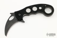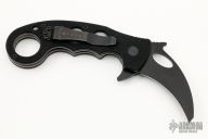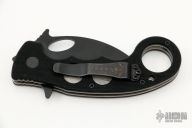 This Emerson Karambit Flipper has a black chisel ground hawk bill blade with notched thumbrest, thumbhole, flipper and wave feature. Handle is comprised of black G10 scales, titanium liners with and has a lanyard hole at the butt. Also has a black stainless steel clip positioned for right or left handed tip up carry. Serial number 0121. Excellent condition. Comes with original box and papers.