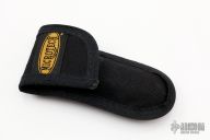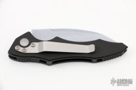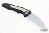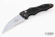 This Kestrel by Microtech is a side opening automatic has a satin finish blade with a partially serrated edge and a black aluminum frame with non-slip inlays and green posts. Stainless steel clip, tip up carry. Dated 06/1999. Comes with original box and nylon sheath. Excellent condition.