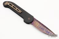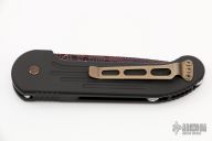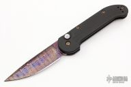This LUDT side opening automatic by Microtech Knives has a Damascus blade. The handle has a black anodized aluminum frame, mother of Pearl inlaid push button, with a tip down stainless steel clip. Comes with original box and papers. Excellent condition.