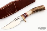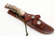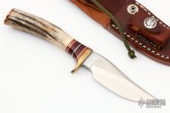 The miniature Model 27 debuted in Randall's 2012 75th anniversary catalog and is the first catalog miniature model. This knife has a 3.5" stainless steel blade, .172" blade stock and 1.024" blade depth, hidden tang construction. The handle has a brass guard and butt, stag grip, and red/brass/white/red linen micarta/black/aluminum spacer pattern. Comes with a brown leather sheath and a zippered case.