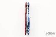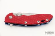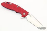 This 3.5" Spanto ground XM-18 from Rick Hinderer features a stonewash finished blade with notched thumbrest and flipper. Red G-10 scale and anodized and stonewashed titanium frame and pocket clip. Dual thumb studs and notched thumbrest. Reversible pocket clip. Strong lock up, nice detent and blade seating is center.  Blade Steel: S45VN. Excellent condition.  Comes with original box and extra hardware.