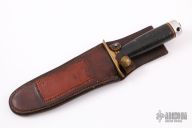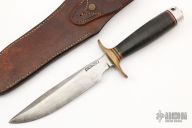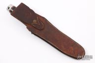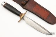 "The Model 1 was made famous by Allied combat troops in World War II and has since been widely used in all theaters of war." This particular knife was used in WWII, has been resharpened, used, lots of scratches and dings, what a story this knife has. .199" blade stock and 1.106" blade depth, satin finish blade with a used to be sharpened top edge. Brass guard, stacked leather handle with red/white/blue spacers, and duralumin butt cap with lanyard hole and brass nutt. The blade has "C.A. Revis" on the b-side. Includes brown leather sheath made by HH Heiser, not sure if this was brown button or not, there is a cut in the top of the sheath, the buttons are worn down and the stone pouch has been removed, which was common with Theatre carried knives. This knife is old and abused, but likely has an amazing story we can only speculate on.