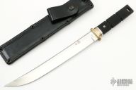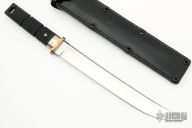 This Model 4005 Shugoto by Al Mar features a satin finished upswept blade, .191" blade stock and 1.150" blade depth, hidden tang construction. The handle has a brass guard, black checkered FRN grip with stainless steel and brass spacers, lanyard hole at the butt. Comes with black leather sheath. Excellent condition. Very hard to find. #169/200