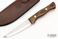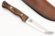 This Voyager from Adventure Sworn features a hand rub satin finished scandi ground blade with .119” blade stock and .988” blade depth, full tang construction. The handle has black/brown canvas micarta scales with brass pins. Comes with a brown leather sheath. Excellent condition.