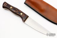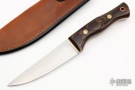This knife from Adventure Sworn features a satin finished full flat ground blade with .123” blade stock and 1.282” blade depth, full tang construction. The handle has black/brown/tan canvas micarta scales with brass pins and yellow liners. Comes with a brown leather sheath. Excellent condition.