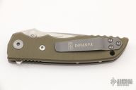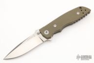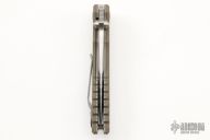 This HB03 folder from Fantoni Knives features a spear point, tumble finished blade with dual thumb studs, notched thumb ramp and flipper. The handle is comprised of green G-10 scales over bead blasted titanium liners and barrel spacers, bead blast tip up titanium pocket clip. Has a couple scuffs, otherwise excellent condition. Comes with original box and papers.
