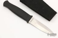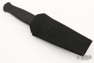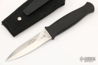 This Loveless Design Gerber Guardian Boot Knife has a double-edged satin finished spear point blade with black aluminum handle, .173" blade stock and .806" blade depth, hidden tang construction. Comes with black nylon sheath with clip. Excellent condition. #037476
