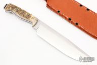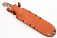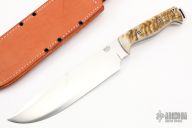 This Bravo Crusader from Bark River features a satin finished blade with .262" blade thickness and 1.851" blade depth, full tang construction. The handle has sheep horn scales with blue liners and mosaic pins. Comes with a leather sheath and original box. Excellent condition.