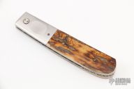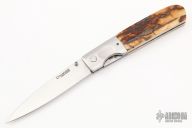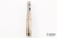 This knife by the late Frank Centofante features a hand rub satin finished blade with single thumbstud. The handle has dovetailed stainless steel bolsters, mammoth ivory scales, anodized titanium liners and fileworked backspacer. Nice detent, lockup and blade seating. Comes with a zippered case. Excellent condition.