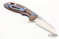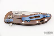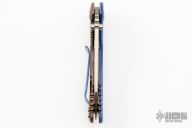 This XM-18 by Rick Hinderer features a stone wash finished blade with notched thumbrest and flipper. The handle has an anodize finish titanium frame, blue G-10 scale, tip up or down reversible titanium clip and filler tab. Has a couple light scuffs, otherwise great condition.