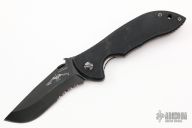 'The Emerson Commander is a 21st century combination of design, materials, performance, and razor sharpness. This knife along with other Emerson Knives, sets the new standard for the cutlery industry and continues to push the design and performance envelope for cutting tools well into the 21st century.' 'The Commander knife-battle tested and proven-incorporates some of the most advanced ergonomics ever featured on a folding knife. The knife, already in use with elite armed forces, European Military strike teams and NATO Counter-Terrorist units throughout the world was chosen by the U.S. Navy SEAL teams for issue to special units within the Naval Special Forces Units. Because of its ruggedness, it has become a favorite of hunters, outdoorsman and adventurers the world over. It features the patented 'wave shaped opening feature.' This production Commander linerlock folder has a black partially serrated blade and black G10 handle. Wave feature. 2002. Comes with original box. Has some light scuffs and scratches, otherwise good condition.