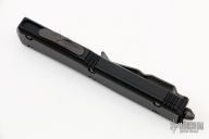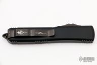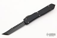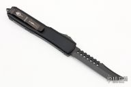 This Ultratech Hellhound by Microtech Knives features a black stonewash DLC blade with notched thumbrest and fullers, false top edge. The handle has a black aluminum frame with tip down black stainless steel clip, black DLC hardware, black titanium thumbslide. Comes with original box and papers. Excellent condition. Dated 06/2021 and s/n 288.