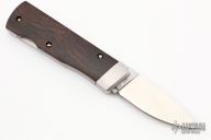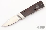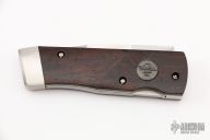This Rolox Diamondback from Benchmark features a chisel ground, satin finish blade with swedge and cocobolo handle. Opening mechanism pushes blade up and out the front, then locks. Stainless steel liners and stainless steel bolster. Scuffs/scratches are visible on the blade and handle otherwise the knife is in good condition.