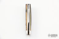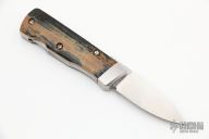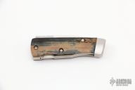 This Benchmark Sidewinder Mammoth Ivory is a very rare slide back "folder". The design is simple yet effective. Feature stainless steel bolsters, liners and lockbar with beautiful mammoth ivory scales that contour nicely to your hand. You push down on the back of the thumb notches of the blade to release and slide it forward into position. Very neat design. Has some light scuffs and scratches, great condition otherwise.