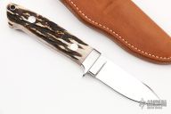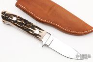 This Semi-Skinner by John Young features a mirror polished blade with .190" blade stock and .94" blade depth, full tapered tang construction. The handle has a mirror polished stainless guard, stag scales and red liners. Lanyard hole at butt. Comes with brown leather sheath. Excellent condition.