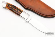 This Drop Point Hunter by John Young features a mirror polished blade with .166" blade stock and .956" blade depth, full tapered tang construction. The handle has a mirror polished stainless bolsters front and rear, amber stag scales and red liners. Lanyard hole at butt. Comes with brown leather sheath. Has some light scratches, otherwise excellent condition.
