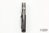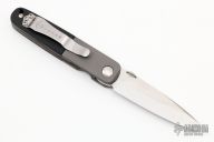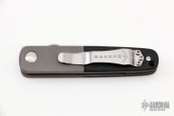 This Custom MV-1 by Emerson Knives features a V-ground blade with knurled thumbstud and a swedge. The handle has bead blasted and dovetailed titanium bolsters, black G-10 scales and backspacer, bead blasted titanium liners, tip up black stainless steel clip. Nice detent, lockup and blade seating.  Comes in the original box with paperwork.  New from maker!