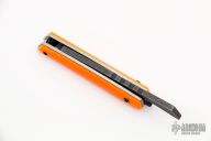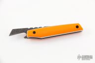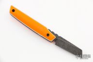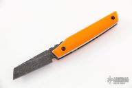 This 86 by Nick Swan features a tumbled blade with notched thumbrest, opens like a friction folder and has a double detent system. The handle has Turbo Glow Orange scales, titanium liners. Comes with a soft pouch and COA. New from Maker!