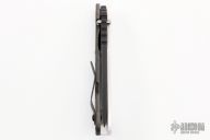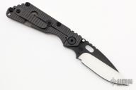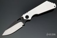 This SNG by Mick Strider features a hand ground tanto blade with thumbhole and notched thumbrest. The handle features white coated milled aluminum and a flamed titanium frame with a matching tip up pocket clip.   Notches on thumbrest, rear of handle.  Includes lockbar stabilizer. Nice detent, blade seating and lockup. New from the 2022 CCKS. This was the show special.