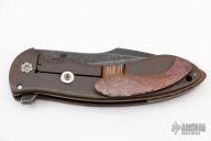 This Orca flipper by Eric Ochs features a dark, tumble finished blade with sedge and flipper. The handle has hammered/colored titanium bolsters and C-Tek scales. Titanium pocket clip is textured to match the bolsters and backspacer. Nice detent, lock up and seating. Gorgeous work from Mr. Ochs. This knife is in excellent condition and shows no signs of use or carry. Comes with velcro case. This knife has the USN logo on the blade and came from a previous USN Gathering.