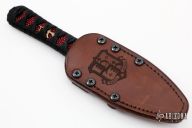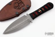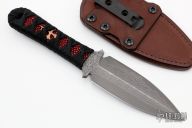 This SBK Assassin from Borka Blades features a double edged Vegas Forge San Mai Damascus blade with .200" blade stock and 1.615" blade depth. The handle is comprised of black cord wrap over red stingray skin with menukis. Comes with a brown leather sheath by Chatanooga Leather Works. Includes a zippered case. Excellent condition. Comes with COA dated 2019.