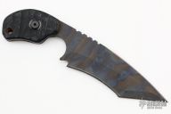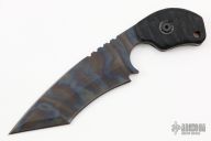 This Rare SLCC by Mick Strider features a tiger stripped recurve nightmare ground blade with sharpened top edge and notched thumbrest, .199" blade stock and 1.68" blade depth, full tang construction. The handle has black G-10 scales. Comes with a kydex sheath. Light sheathing marks are visible on the blade otherwise the knife is in excellent condition.