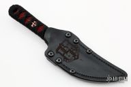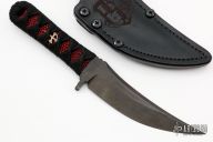 This SBK from Borka Blades features a DLC stonewashed blade with a false top edge, .197" blade stock and 1.350" blade depth. The handle is comprised of japanese style black cord wrap over rayskin, has menuki's on each side, full tang construction. Comes with a black leather sheath by Chatanooga Leather Works. Excellent condition.  Comes with zippered case and COA dated 2019