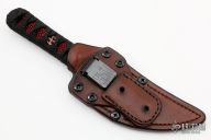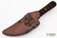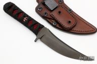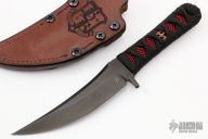 This SBK from Borka Blades features a DLC stonewashed blade with a false top edge, .197" blade stock and 1.350" blade depth. The handle is comprised of japanese style black cord wrap over rayskin, has menuki's on each side, full tang construction. Comes with a brown leather sheath by Chatanooga Leather Works. Excellent condition.