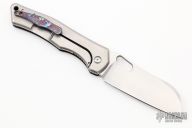 This Custom Catalyst framelock from Gerry McGinnis features a hand rub satin finished blade with thumbhole and notched thumbrest. The handle a carbon fiber front scale with black rag micarta inlay, milled titanium lockside, mokuti tip up clip, carbon fiber backspacer. Blade is centered when closed and locks up with no movement. #011 and dated 5-28-22. Excellent condition. Comes with a zippered case.